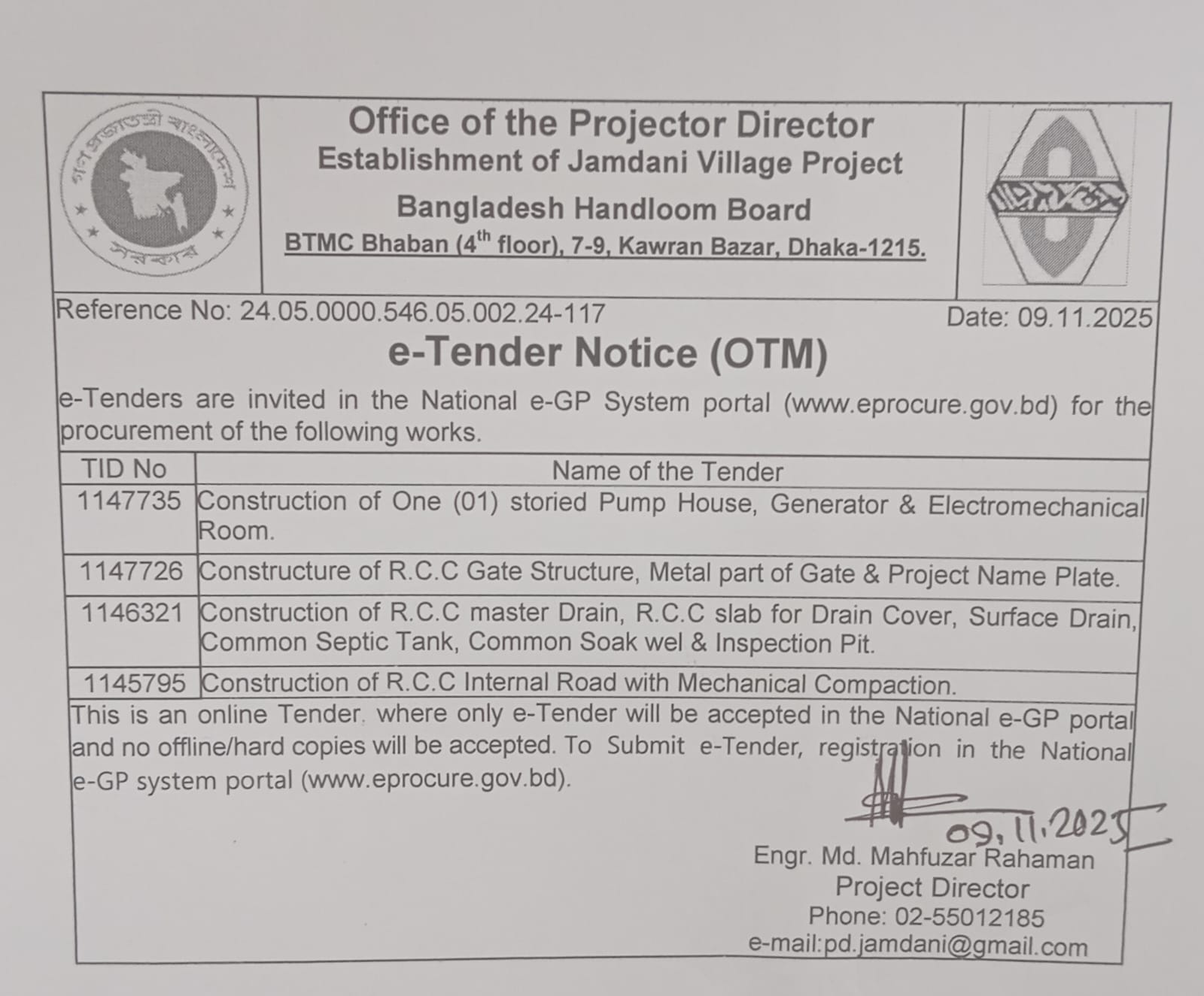 | ৩ | জামদানি ভিলেজ প্রকল্পে পাম্প হাউজ, জেনারেটর ও ইলেকট্রোমেকানিক্যাল কক্ষ নির্মাণ সংক্রান্ত। | ০৯-১১-২০২৫ | দেখুন | |||